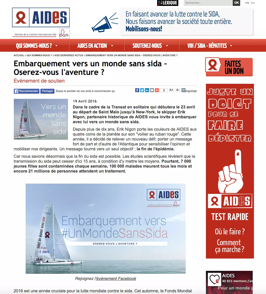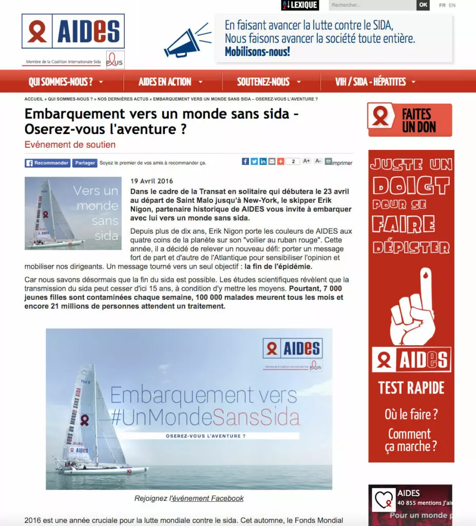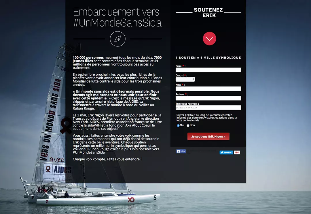 In early June, the skipper Erik Nigon, a long-time partner of AIDES, will set sail towards a world without AIDS. As part of the Solo Transat, aboard his Red Ribbon Sailboat, he will carry a powerful message across the Atlantic to raise awareness and mobilize our leaders. The message is aimed at one single objective: putting an end to the AIDS epidemic. Erik needs your support to share his message with the world. From April 25th to May 2nd, add your voice to those of the many who have already chosen to support Erik in this incredible journey. Each show of support represents a symbolic nautical mile that will help the Red Ribbon Sailboat go as far as possible towards #AWorldWithoutAIDS.