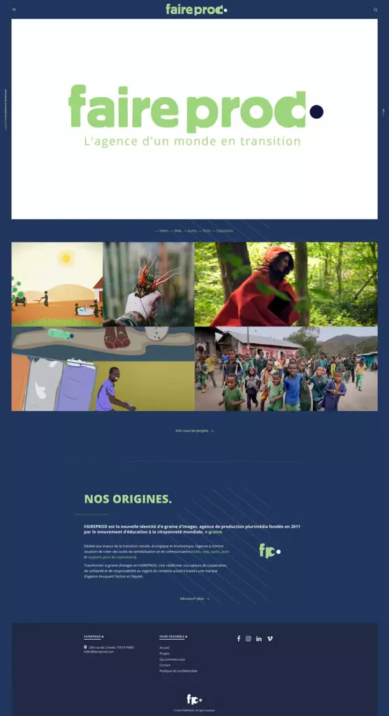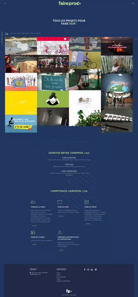 Arnaud Fonquerne a créé le site web et organisé les contenus via la conception de scénarios de navigation. L’accompagnement Social Media (conception du calendrier éditorial et création des stories Instagram qui présentent les projets de Faireprod) a également été réalisé par Arnaud.